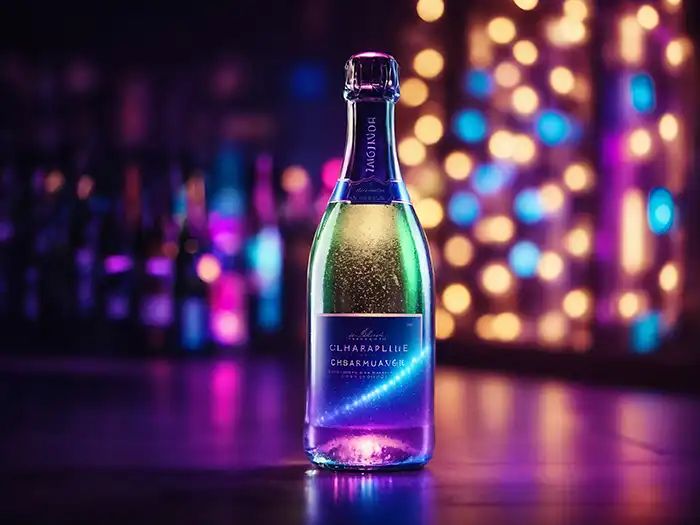 帶有令人眼花繚亂的全息標(biāo)簽的香檳瓶,被充滿活力的霓虹燈照亮