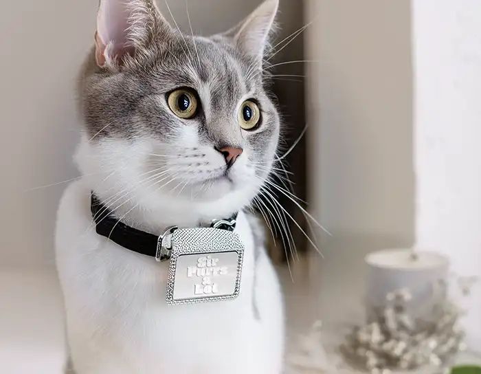 一只好奇的灰白色貓,戴著黑色項(xiàng)圈,項(xiàng)圈上有閃亮的銀色 BOPP 標(biāo)簽,上面寫著 Sir Purrs-a-Lot。