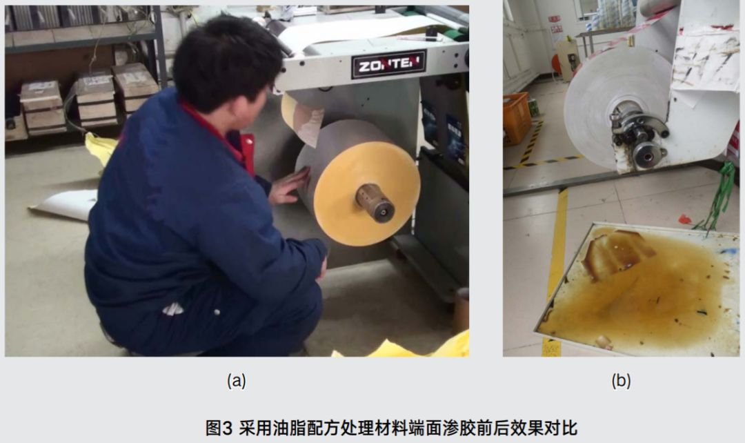 根據(jù)這個原理,華益印刷廠的原材料也出現(xiàn)了端面滲膠問題,如圖3(a)所示。我們按照黃油80%,機油20%的比例配置了油脂配方,用古布均勻地涂抹在滲膠表面,大概半小時以后,粘合劑軟化、稀釋,設(shè)備可以正常開機,如圖3(b)所示。值得注意的是,這種方法只是軟化了粘合劑,粘合劑還客觀存在,因此還要做好設(shè)備上輸紙路線上的清潔工作。